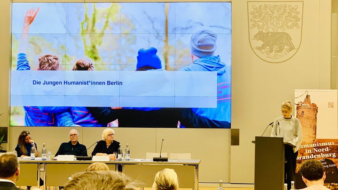 Im Anschluss sprach Bennett von den JuHus aus Brandenburg. Er warf einen Blick auf das Jahr 2025 und stellte die durchgeführte praktische humanistische Jugendarbeit aus Brandenburg dar.