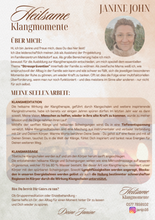 - Die heilsamen Schwingungen der Klangschalen lassen Deinen Geist zur Ruhe kommen... Deine Seele wird berührt - dadurch werden Selbstheilungskräfte wieder aktiviert - Du spürst den Einklang mit Dir und Deinem Körper.